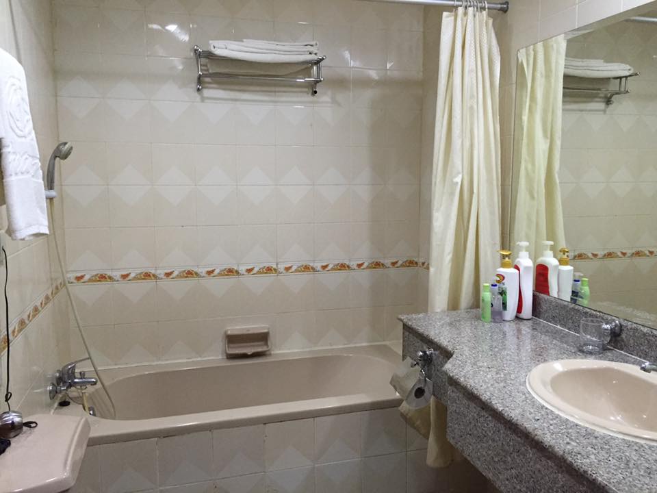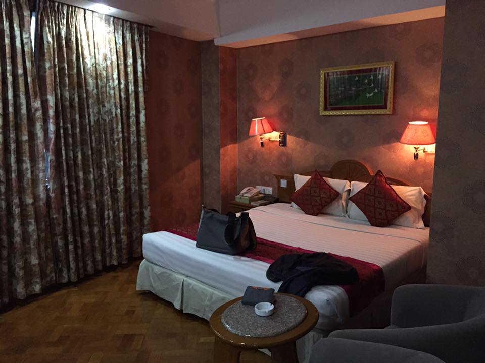 I noticed that my floor hallway and my room had relatively new wallpapers. Mine in the room had a light bronze tone with some flower designs, making the room appear quite dark, even with the lights on. The bed and pillows were sufficient and comfortable. One thing that I admired here the most was the centralized lighting system on the bedside table. For a hotel of that class, I thought it was a wise investment. There was also a fridge and an LCD TV (two English channels only: one news, not CNN, and another sports; sometimes there are English movies appearing on some channels — best to bring movies on your USB or an HDMI connector to watch movies streamed on your laptop or iPad straight on the TV screen).